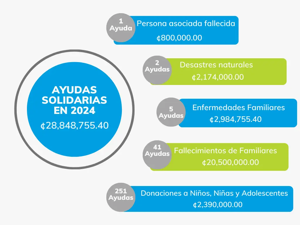 - Ayuda solidaria por fallecimiento de ¢800,000.00 en caso de fallecimiento de la persona asociada y de ¢500,000.00 por deceso de familiares con primer grado de consanguinidad y afinidad (padres, hijos y cónyugue). La vigencia de este derecho será de tres meses a partir de la fecha del deceso.