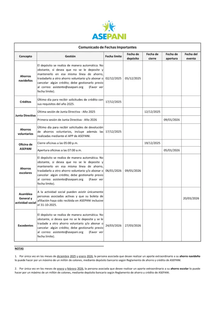 Fechas Importantes de ASEPANI para el periodo 2025-2026, fechas límite, depósitos, aperturas, cierres y eventos correspondientes a ahorros navideños, créditos, sesiones de Junta Directiva, ahorros voluntarios, horarios de oficina, ahorros escolares, Asamblea General y excedentes. Incluye también notas aclaratorias sobre la posibilidad de realizar aportes extraordinarios en meses específicos.